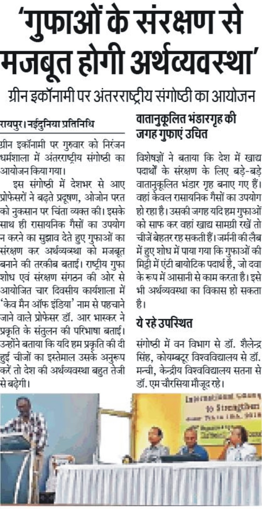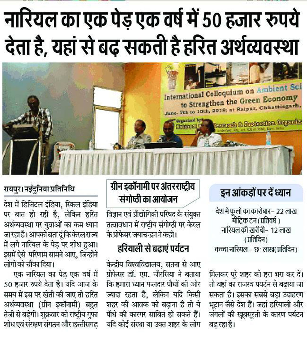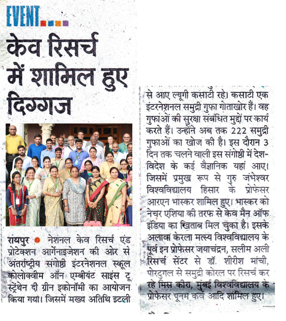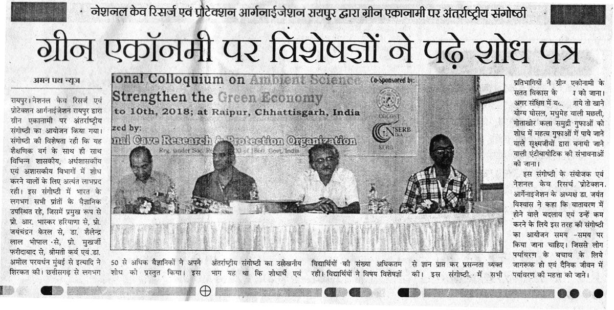 National Cave Research and Protection Organization, India organized an International Conference which was very beneficial to educationists and researchers from the agricultural and environmental sectors too. Eminent scientists, Prof. R.N. Baskar (Haryana), Prof. Jayachandran (Kerala), Prof. Poonam Kurve and Dr. Amol Patwardhan (Mumbai), Dr. Shailendra Lal (Bhopal), Prof. R.K. Pradhan (Raipur), Mr. Julian Fortin & Ms. Kira van de Sande, Dr. S. Manchi (Coimbatore) graced various scientific sessions.. Almost fifty scientists from all over the country presented their papers. Researchers and students got a golden opportunity to present papers and gain guidelines and ideas from stalwarts of the field. The light was thrown on various topics like edible nest conservation, diabetic fish, antibiotics made from cave-dwelling microbes and the beautiful world of underwater sea caves.