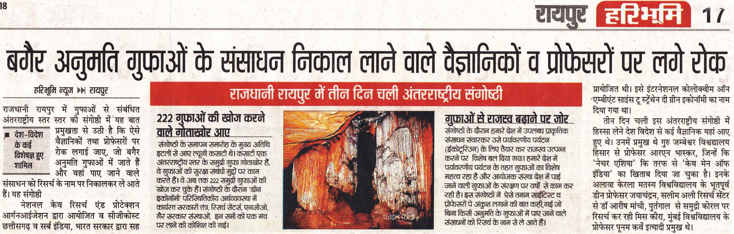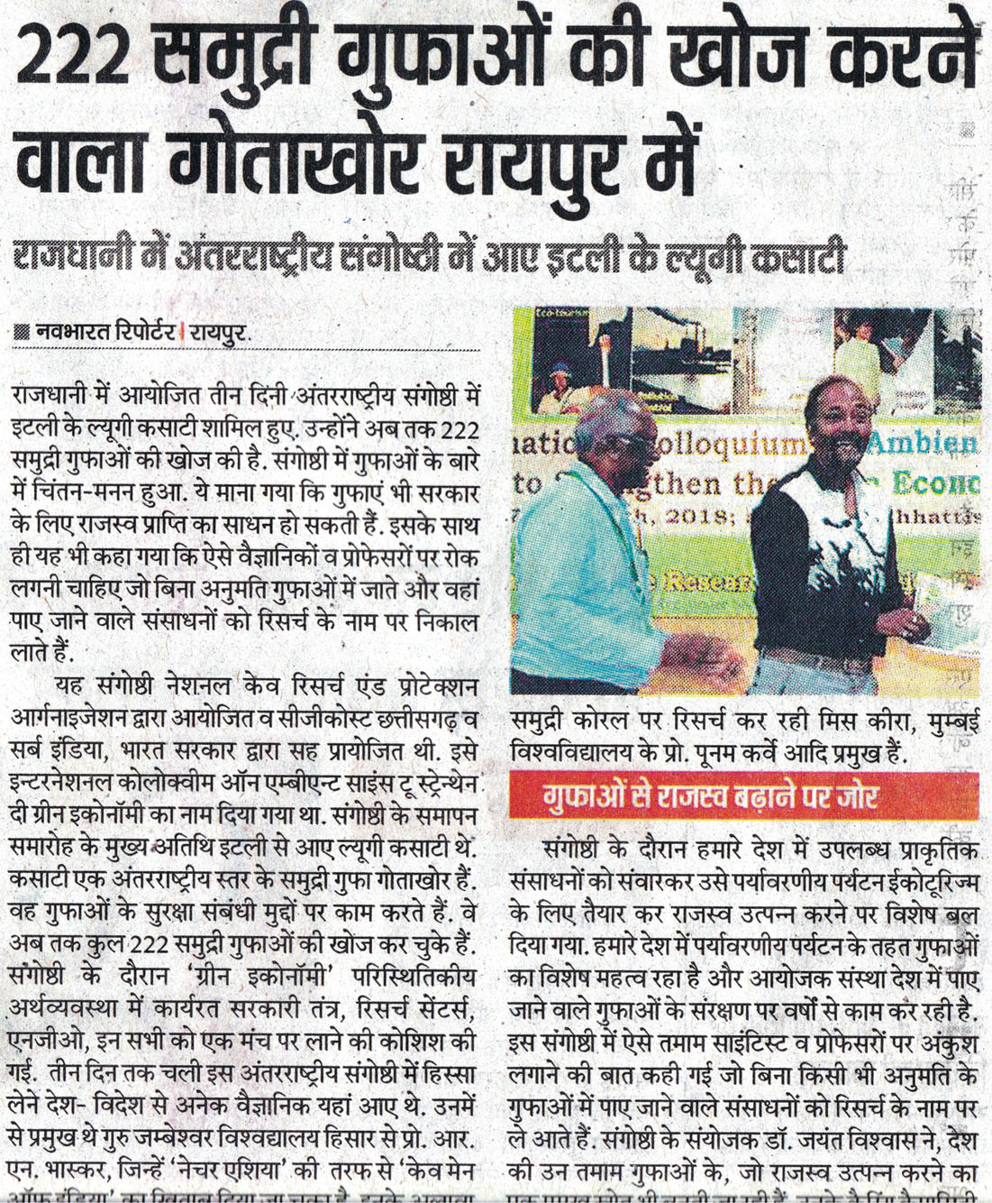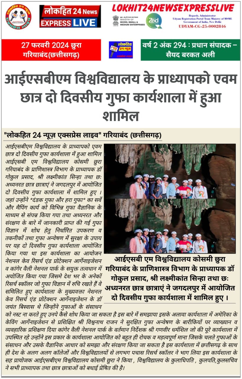 National Cave Research and Protection Organization, India organized an International Conference which was very beneficial to educationists and researchers from the agricultural and environmental sectors too. Eminent scientists, Prof. R.N. Baskar (Haryana), Prof. Jayachandran (Kerala), Prof. Poonam Kurve and Dr. Amol Patwardhan (Mumbai), Dr. Shailendra Lal (Bhopal), Prof. R.K. Pradhan (Raipur), Mr. Julian Fortin & Ms. Kira van de Sande, Dr. S. Manchi (Coimbatore) graced various scientific sessions.. Almost fifty scientists from all over the country presented their papers. Researchers and students got a golden opportunity to present papers and gain guidelines and ideas from stalwarts of the field. The light was thrown on various topics like edible nest conservation, diabetic fish, antibiotics made from cave-dwelling microbes and the beautiful world of underwater sea caves.