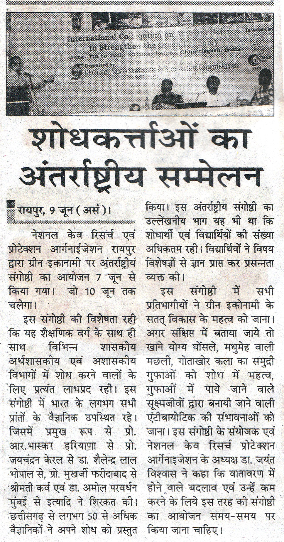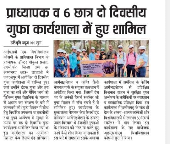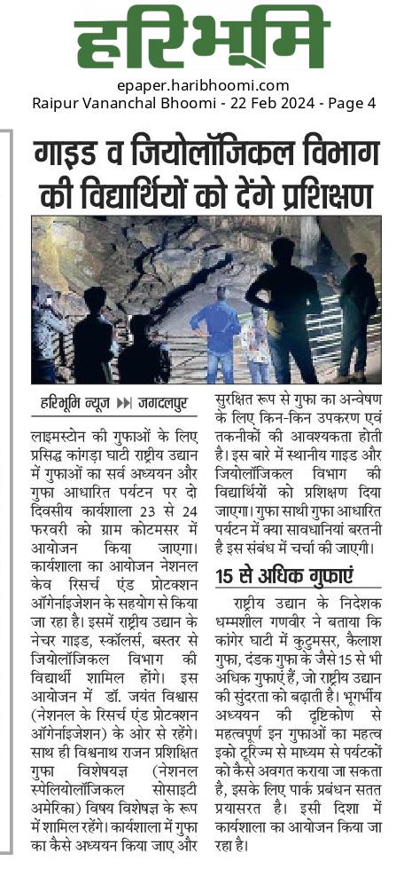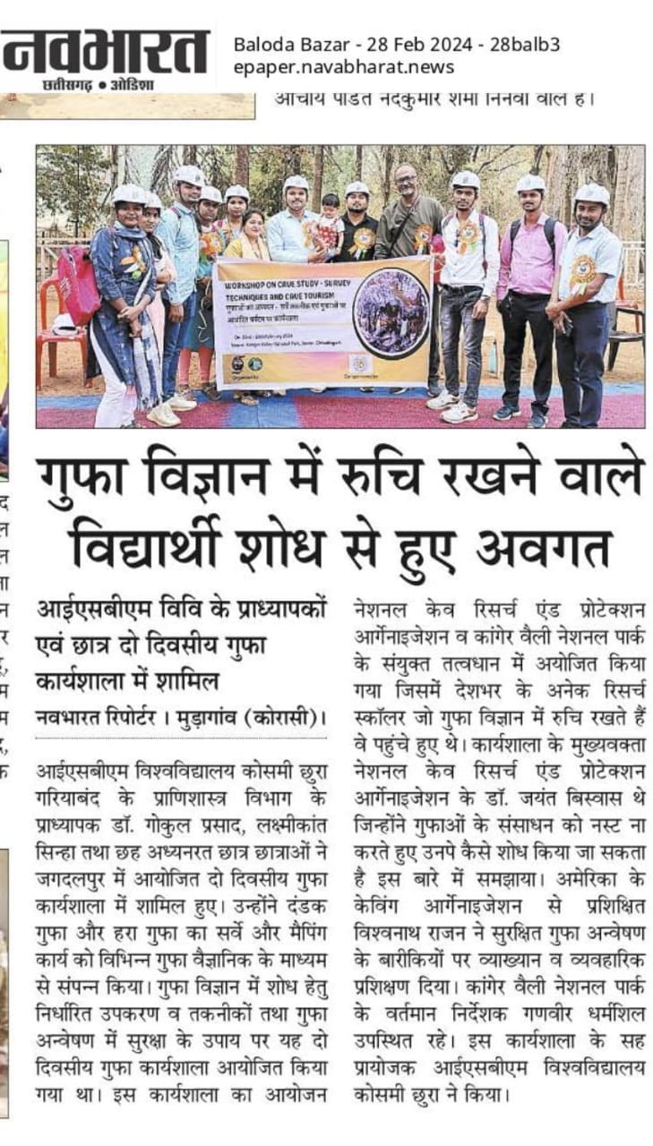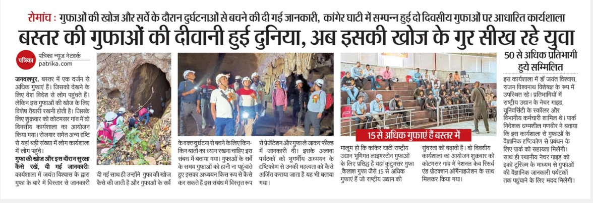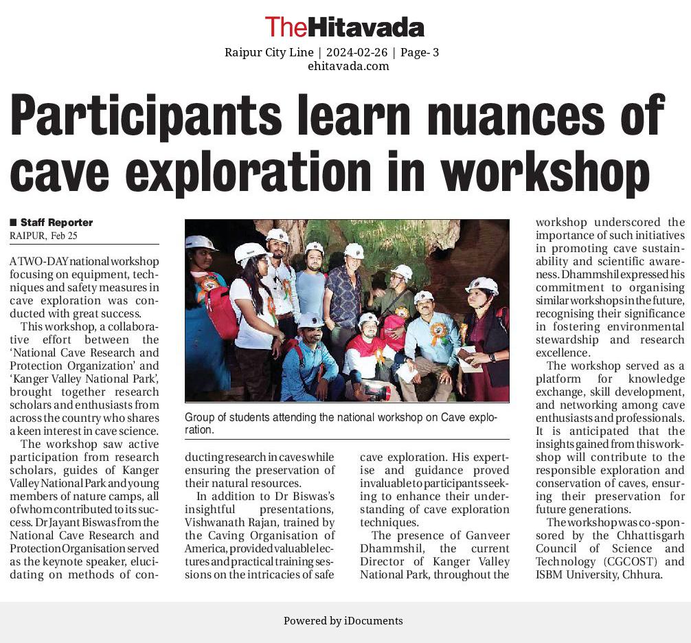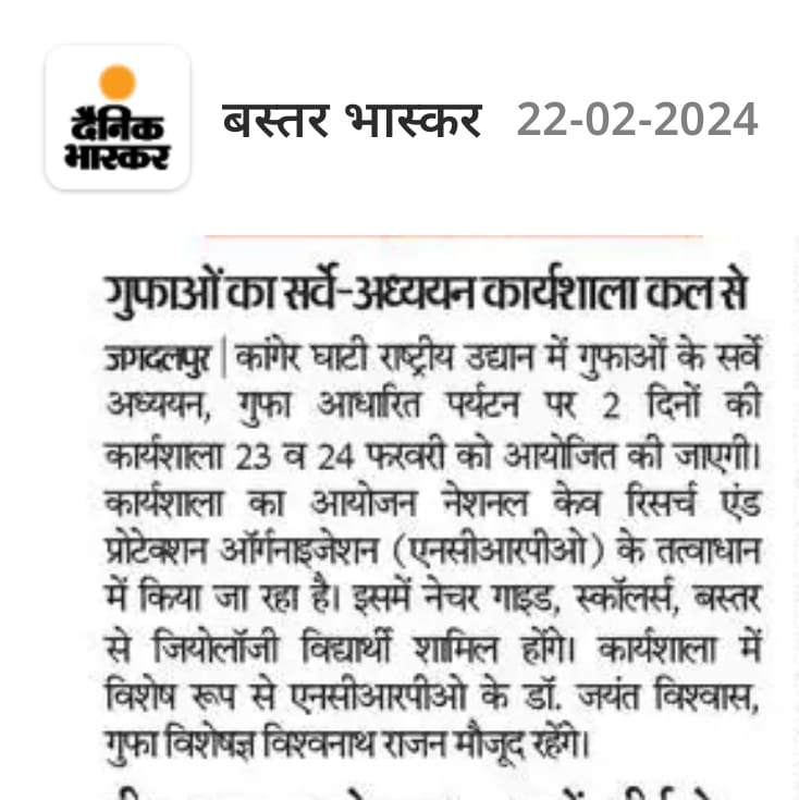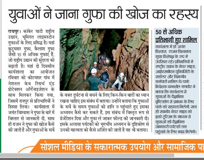 A Workshop entitled "2-day National Workshop on Tools and Techniques Needed for Safe Caving and Studies of Cave Science" was organized by the National Cave Research and Protection Organization (NCRAPO) in the premises of Kanger Valley National Park (KNVP) with the joint execution of the Directorate KNVP, Bastar, Chhattisgarh. More than 70 participants attended it from all over the country. Dr Jayant Biswas (Director) NCRAPO, India, Shri Ganveer Dhammsil (Director) KNVP and Shi Vishwathan Rajan a Scuba Diving instructor, India were the main speakers in it. It was the first workshop in itself from India where all the safety issues of caving and cave mapping were practically explained. In this workshop, all the branches of science which could be approached for higher studies have been elaborately explained. The workshop was highly successful.