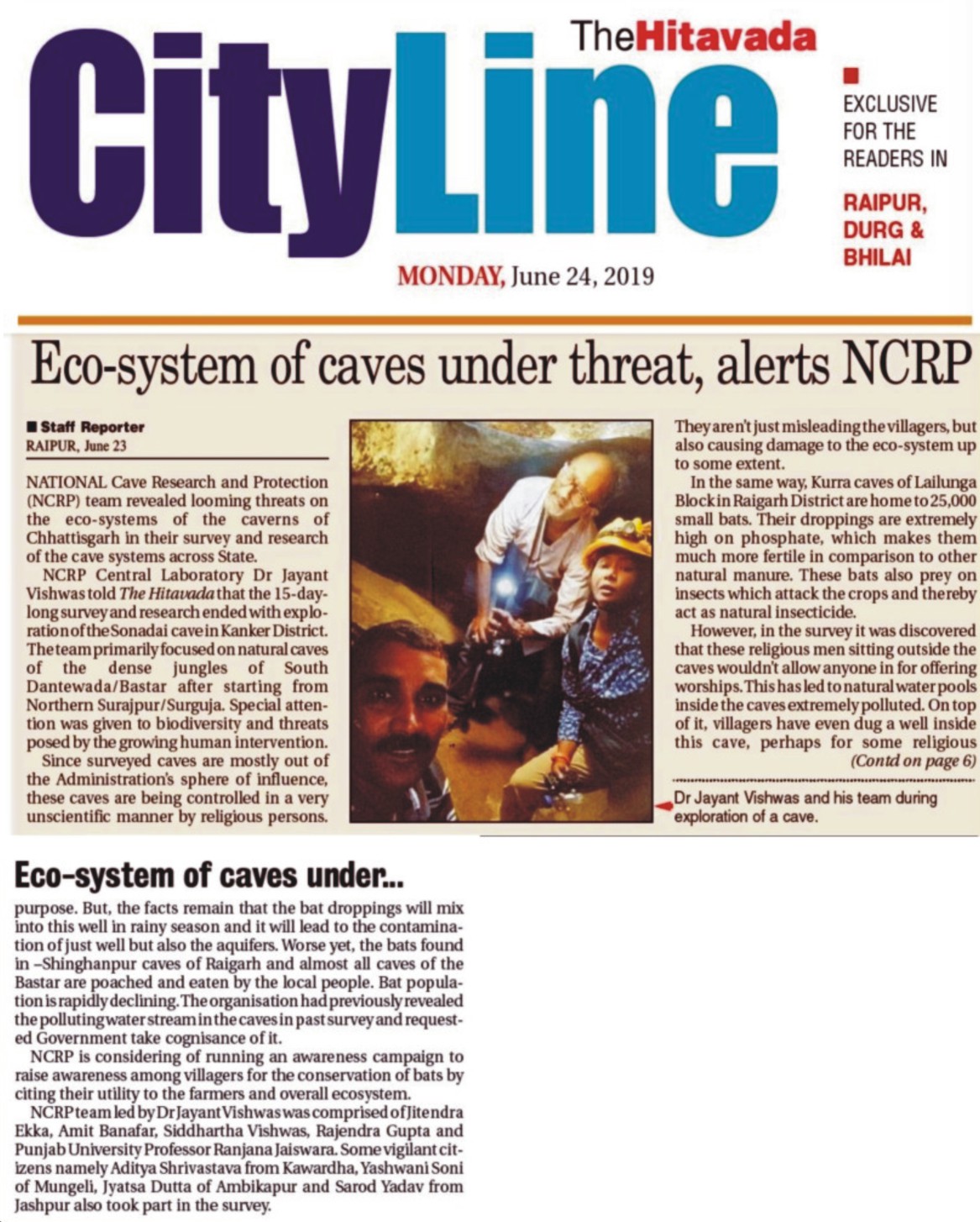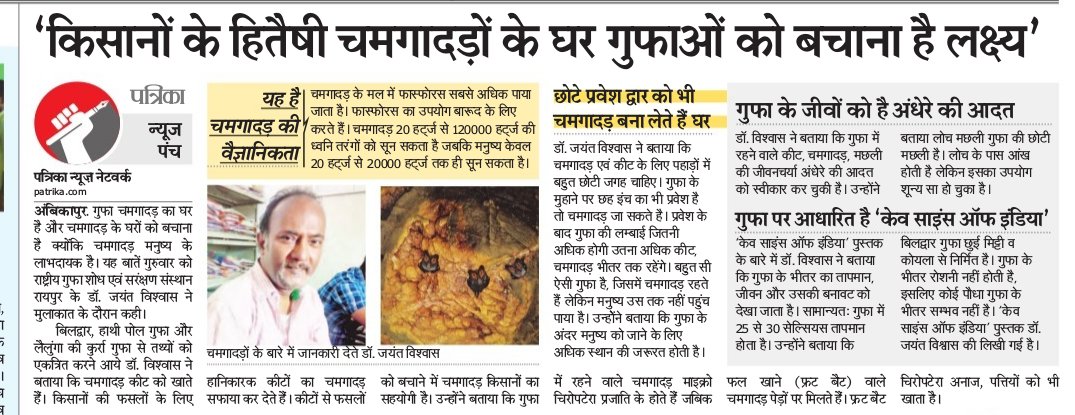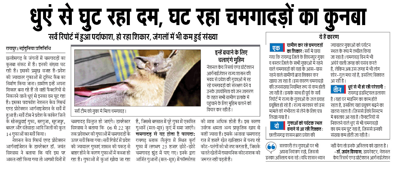 NATIONAL Cave Research and Protection Organisation team revealed looming threats on the eco-systems of the caverns of Chhattisgarh in their survey and research of the cave systems across State. NCRP Central laboratory Dr Jayant Biswas told The Hitavada that the 15-day-long survey and research ended with an exploration of the Sonadai cave in Kanker District. The team primarily focused on natural caves of the dense jungles of South Dantewada, Bastar after staffing from Northern Surajpur, Surguja Special attention was given to biodiversity and threats posed by the growing human intervention. Since surveyed caves are mostly out of the Administration's sphere of influence these caves are being controlled in a very unscientific manner by religious persons. They are not just misleading the villagers but also causing damage to the ecosystem up to some extent. In the same way, Kurra caves of Lailunga Block in Raigarh District are home 1,25,000 small bats. Their droppings are extremely high on phosphate, which makes them much more fertile in comparison to other natural manure. These bats also prey on insects that attack the crops and (hereby act as a natural insecticide. However. in the survey, it was discovered that these religious men sitting outside the caves wouldn't allow anyone in for offering worships without their consent. This has led to natural water pools inside the caves extremely polluted. On top of it, villagers have even dug a well inside this cave, perhaps for some religious purpose. But, the facts remain that the bat droppings will mix into this well in the rainy season and it will lead to the contamination of just well but also the aquifers. Worse yet, the bats found in -Shinghanpur caves of Raigarh and almost all cases of the Bastar are poached and eaten by the local people. Bat population is rapidlydeclinin&Theorganisation had previously revealed the polluting water stream in the caves in the past survey and request-ed Government takes cognizance of it. NCRP is considering running an awareness campaign to raise awareness among villagers for the conservation of bats by citing their utility to the farmers and overall ecosystem. NCRP team led by Dr. Jayant Biswas was comprised of Jitendra Nakka, Amit Banafar, Siddhartha Biswas, Rajendra Gupta and Punjab University Professor Ranjana Jaiswara. Some vigilant citizens namely Aditya Shrivastava from Kawardha.Yashwani Son of Mungell. Jayatsu Dutta of Ambikapur and Sarad Yadav from Jashpur also took part in the survey.