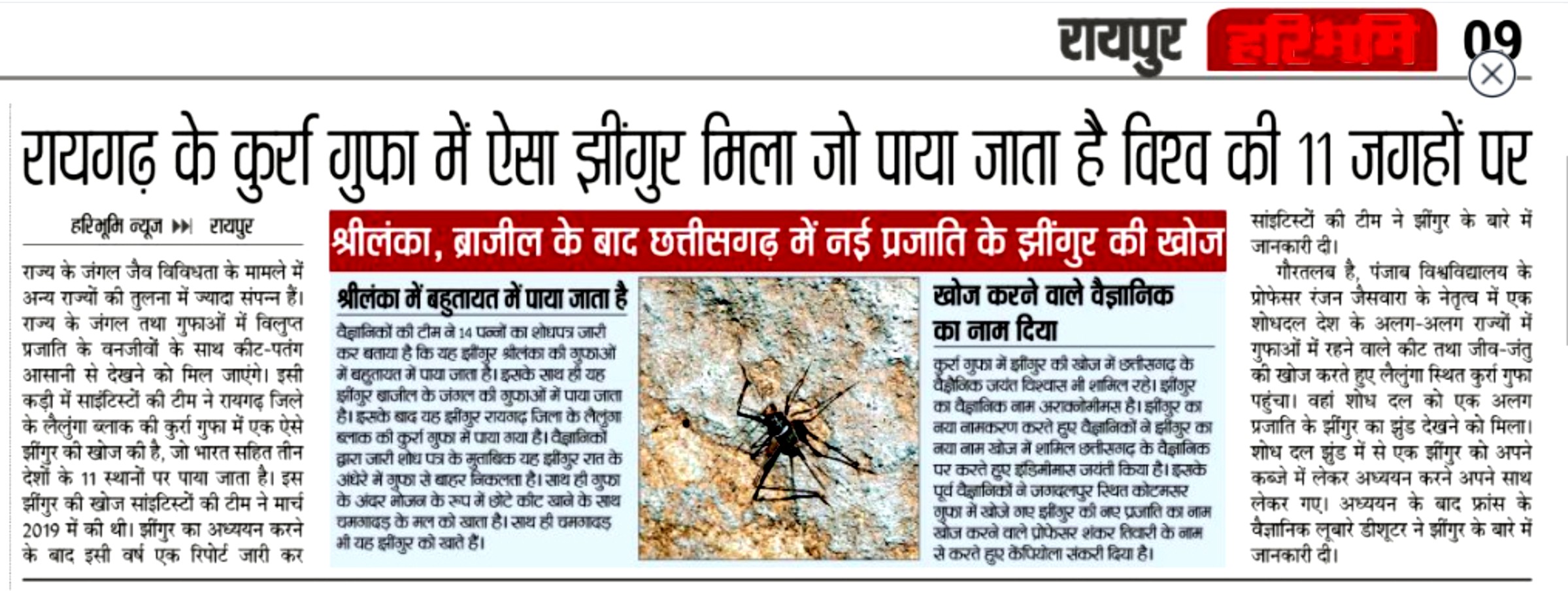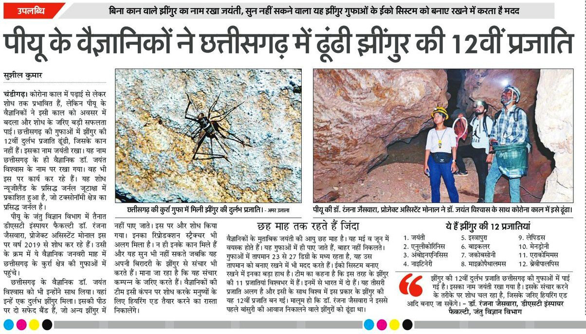 A new species of cricket from a cave of Chhattisgarh "Kurra Cave" has been discovered and given new status by cricket specialist of India Dr. Ranjana Jaiswara of Punjab University in association with Prof. Laure Desutter-Grandcolas of France. The species name is Archnomimum (indimimus) jayanti . The paper published in Zootaxa in the month of April, 2021.