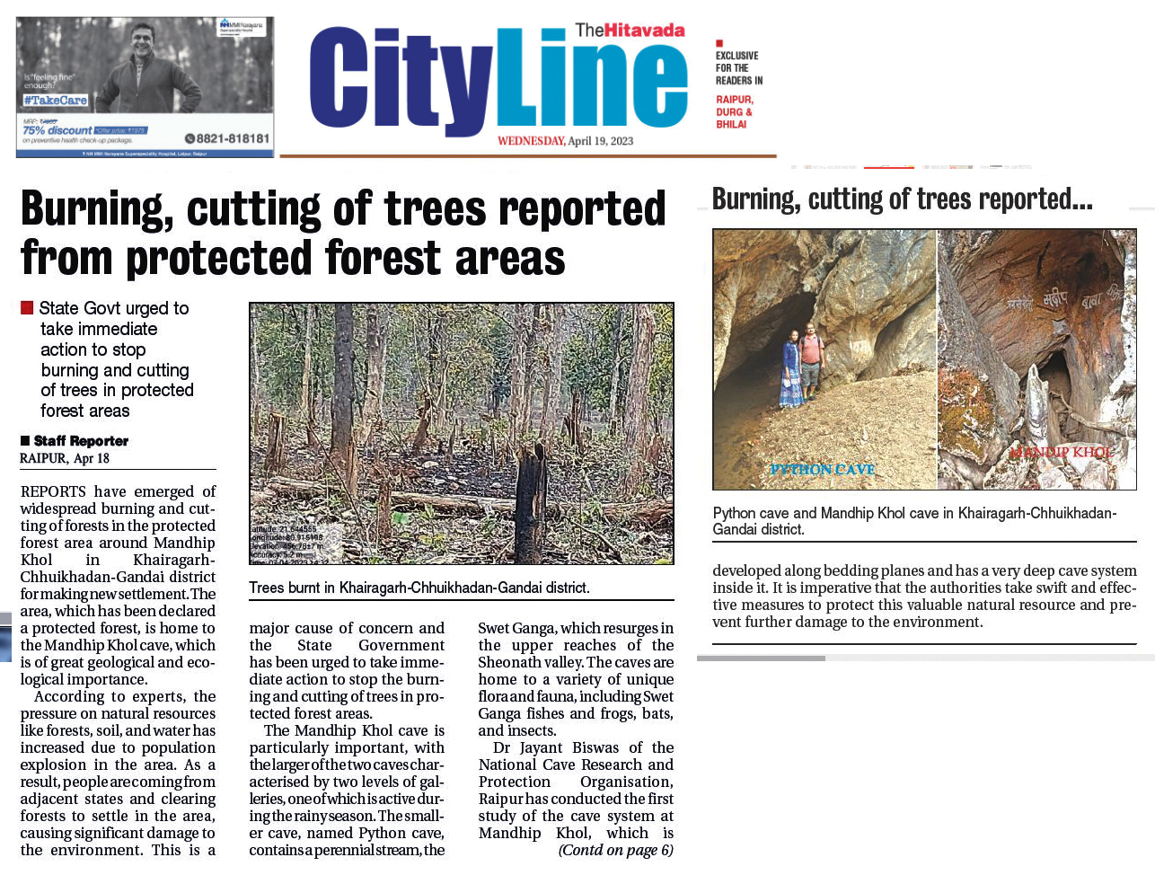 REPORTS have emerged of widespread burning and cut tingof forests in the protected forest area around Mandhip Khol in Khairagarh Chhuikhadan-Gandai district form a king newsettlement.The area,which has been declared a protected forest, is home to the Mandhip Kholcave,which is of great geological and eco logical importance.